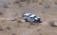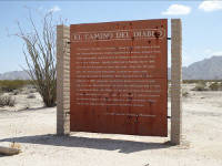 "The Road of the Devil is a rough, unpaved route which begins in Altar and Caborca Mexico and crosses southwestern Arizona, ending in Yuma. Prehistoric peoples used the route to transport shells and salt from the Gulf of California. Spanish soldiers led by Melchior Diaz in 1540 were the first Europeans to travel this route. More than 150 years later, the Jesuit priest, Father Kino, traveled the region while exploring for routes to California. After the discovery of gold in California in 1849, thousands traveled the Camino in search of gold and new lives. Historians estimate more than 400 people died of thirst on the Camino during the 1850s. At one time, at least 50 graves could be identified along the route. Today the area (part of which is listed on the National Register of Historic Places) is under restoration. Please stay on the road and help us protect this historic resource." Mile 7.5. 32°25'49.4", 114°05'13.0"W. Junction C-14 and a trail to Raven Butte, a distinctive mound of Miocene basalt. It was probably named for its raven-black color, though one source who never saw it said it was named for ravens living in the area. Mile 9.4. Signpost C13 and trail to southwest. Continue straight. Mile 10.0. 32°27'52"N, 114°06'17.5"W. Cipriano Pass junction and signpost C-12. Continue straight (northwest). Road to southwest takes you to Cipriano Pass. Also sign S-56 for a military bivouac site. Pass may be named for Cipriano Ortega, head of a family hacienda near Santo Domingo along the Sonoyta River in Sonora, but it is not to be confused with Cipriano Pass or Cipriano Hills in Organ Pipe Cactus National Monument. The Ortega family sometimes drove cattle from Sonoyta to Mexicali, Mexico, and freight wagons to Yuma. Mile 10.7. Military bivouac site S-55. Continue straight. As you go.... Miles 10.7 to 11.3: Note grass, mallow, white bursage, and white-stem milkweed (Asclepias albicans), plus diamond cholla (Cylindropuntia ramosissima) growing in runoff runnels. Even ironwood trees (Olneya tesota) and other large plants grow along them. The runnels flow across the roadway, but road grading blocks or re-channels them, leaving plants on the downstream side of the road with less water and affecting their growth. If you walk along a runnel, you'll find animals seeking shade and food. The functions and values of runnels are analogous to riparian habitat. Runnels also nourish cryptobiotic soils, and their growth patterns on the ground may reveal where rainwater runs or pools. Mile 11.3. Road widens a bit. Mile 11.5. Junction C-11 and military staging area S-54. Heed laser warning signs from here to C-8. Do not hike or drive west of the road. Mile 12.5. Military bivouac area S-53 to the west. Continue straight. At certain times of the year, large contingents of Marines camp along this road in military training exercises such as the Weapons and Tactics Instructor course (WTI), an advanced tactical aviation exercise designed to train weapons and tactics instructors.