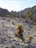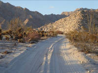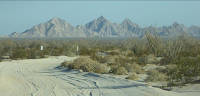 As you go... Miles 16.5 to 16.8: Possible campsites, with interesting plants on slopes. NO hiking west of road due to laser hazard area. Those signs about unexploded ordnance and lasers in use? What they're really saying is, "Survivors will be taken to jail." One author is sketching the plot to a novel about a desert hiker who crosses that line and is blinded by a laser beam, so he must wander alone through the sands, feeling his way through the cactus forest and.... The story does not have a happy ending.
