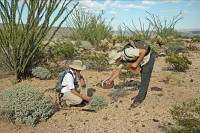 As you go.... Miles 7.2 to 7.4: Stressed, dying, or dead plants. How can you have a drought in a desert, which is already dry and hot? Desert plants are accustomed to scant and unpredictable rains, but they still need water. When they are forced to contend with warmer and drier times year after year, they fail. Although many of the elephant trees are still standing, they are brown and brittle. Wood may decay slowly in the dry desert -- even termites require moisture to make their tubes and digest cellulose. By some accounts, an ironwood may live 300 to 600 years, but accurate dating is difficult because their growth rings indicate rain cycles, not annual seasons, and may be missing or incomplete. Their dead heartwood spars may endure many hundreds of years -- one was dated to have stood 1,600 years after it died. The wood is quite dense and will not float in water. The ironwood tree may reach a height of 45 feet, and many species of birds are known to nest among its branches. In the nitrogen-rich soil beneath the tree -- a nitrogen fixing legume -- researchers such as Gary Nabhan have documented more than 250 species of desert plants growing from seed. The Spanish name is palo fierro, meaning iron wood. Ironwood Forest National Monument, northwest of Tucson, is another place you may wish to visit.