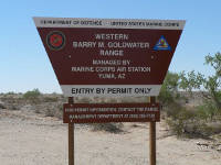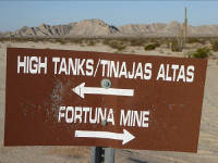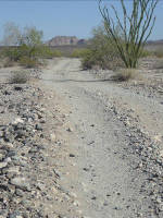 Mile 20.1. 32°28'26.1"N, 114°18'14.0"W. Trail to Spook Canyon. Sign A-8 set in pyramid of rocks. The Goldwater Range-West range management office (RMO) handles environmental and public issues, and in its early days range managers Ron Pearce and Don Little (call-sign "Big") made range signs in their home garages on weekends. Today the office has a dozen employees, including range wardens who patrol the 2,800 square kilometers of desert. Mile 22.4. Raptor nest in saguaro west of road. Mile 23.1. 32°30'22.8"N, 114°20'23.9"W. Junction A-7. Continue straight ahead. Side trail goes east to a rescue beacon. Miles 23.4 to 23.6. Gravel flats here are fairly bare, with ironwood and paloverde trees in small runnels. Mile 24.2. Administrative trail west to "Bootleg." No public access. Mile 24.4. 32°31'25.3"N, 114°20'52.0"W. Major junction. Sign A-6. Sign shows Camino del Diablo going west (left). Continue straight (north) for Fortuna Mine. Or for a smoother but less scenic trip to Yuma, take road to west as described in Alternate route to the west. Fortuna road is rocky and rough.