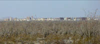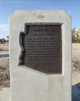 Before you lies a "different" desert, one with more sand, flatter ground, and plants growing father apart, relying on less precipitation. Visually it lacks the nearby mountains and peaks, and the light and colors appear different, perhaps from humidity of the river valley or smoke drifting from field burning. Nearby are creosotes, limberbush (Jatropha cuneata), ocotillo, a few saguaros, and spacious open flats. The Spanish name for limberbush is sangrengado, a contraction for sangre del drago -- dragon's blood, because it "bleeds" reddish sap when injured. It is a member of the large spurge family, and its stems have been used by Native Americans for basketry. Mile 2.9. 32°18'38.7"N, 114°05'33.6"W. A rescue beacon. Continue around the tip of the mountain and go northwest. Mile 3.9. Campsite, surveyor's benchmark, and rocks. Surveying in the desert can be challenging in unusual ways, including the effects of heat on the men, and shimmering heat or mirages distorting accurate readings with their sextants. As Lt. N. Michler, boundary surveyor in 1855 reported, "The heat had become so great as to compel us to operate entirely with signal-fires by night." As you go.... Miles 4.8 to 5.0. Campsites. Large bare flats at edge of mountain and next to sandy washes. As you go.... Miles 5.3 to 5.4: Fine examples of teddybear cholla and cryptobiotic crusts. The crust helps hold the thin soil and scant moisture for the cactus. Many of the dust storms experienced in Arizona originate from unplanted farmlands or construction sites, not the open desert, which is largely held in place by this biotic crust. Interestingly, the weathercaster word haboob is Arabic (habub, gale wind), one of many we borrowed into English. Others include monsoon (mawsim, for season), adobe (at-tuba, brick), alkali (al-kahli, alkaline), caravan (qairawan, a convoy), candy (qandi, sugared), cotton (qutun), and coffee (qahwa, coffee, with mocha coming from the name of a Yemen seaport). One of Yuma's most interesting citizen's ran camel pack-trains to mines near Dome. Nicknamed Hi Jolly, he brought camels to the U.S. from Turkey as part of Lt. Beale's experiment to use "the ships of the desert" in the American Southwest to carry military supplies. His Arabic name was Hadj Ali. And if you began you trip in Ajo or Organ Pipe, you may have seen references to Kalilville (the name for Lukeville at one time) or signs for Alley Road or Tom Alley Courthouse. The Syde Kalil family -- Ajo stalwarts -- hailed from Syria about 1900, and the Judge Tom Alley's grandfather was Turkish and originally named Muhammad Ali -- while passing through England on his way to America he changed it to Alley. Gary Nabhan's book Arab / American: Landscape, Culture, and Cuisine in Two Great Deserts tells us more. And if you return home through Dateland, Arizona, stop in for a date shake made from medjools.