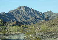 Similarly, triangle-leaf bursage has given up -- westward, you'll find only white bursage, because triangle-leaf requires summer rains as well as winter rains, but white bursage does not. The desert west of the Gila and Tinajas Altas Mountains receives an average of only 2 to 3 inches a year, most of it in winter. Rocks and granite slopes to climb and play on. Campsites. In the evening, even in cooler weather, your camp may be visited by any of several species of insect eating bats that roost in crevices, caves, and old mines. These may include pallid bats, big brown bats, leaf-nosed bats, California myotis, and canyon bat, the most common species in this region. Too, lesser nighthawks fly at dusk hunting insects. The presence of bats is a sign of a healthy ecosystem. As you go.... Miles 1.1 to 1.6: Look for bighorn tracks in sandy washes and roadway where they cross from one mountain to another or feed on plants along the washes. What is here for them to eat? Among their favorite foods are leaves, twigs, and flowers of ironwood, paloverde, catclaw, fairy duster, Mormon tea, burrobush, ditaxis, and ocotillo; cactus, such as fishhooks and barrels; a variety of grasses; and forbs such as mallow, Indian wheat, and filaree. Their diet consists of roughly 1/3 grasses, 1/3 browse, and 1/3 forbs as seasonally available. Most of these are available in the valleys or mountains around you. Mile 2.3. View ahead of distant Gran Desierto and its sand fields. The Colorado River begins its journey in the Rocky Mountains of Colorado and for eons brought sand and silt downstream, leaving us the Glamis Dunes, Algodones Dunes, Yuma Dunes, Gran Desierto, Colorado River Delta, and the exceptionally rich soil of the Imperial Valley and Yuma Valley. Major tributary rivers bringing the sand and silt are the Green, San Juan, Little Colorado, Virgin, Bill Williams, and Gila rivers.