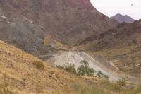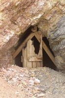 Turn east (right) at B-7 to see more of the Fortuna site. On the slope to the east stood a 20-stamp mill operated by steam-power, and a 100-ton cyanide plant treated the tailings. Native wood, especially ironwood trees from Woodcutters Canyon, was burned for fuel. Total production amounted to $2.6 million, or 124,239 ounces, with almost all of that occurring between 1896 and 1904. One novel feature at the mine was the use of three water catchments -- cisterns, really -- that harvested rain runoff, stored it in sumps in abandoned drifts, let it purify by putrefaction over several months, and then served it for use. The largest "water catch" held 15,000 gallons when full.