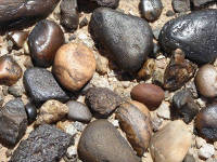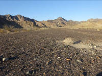 Mile 29.3. Out of the mountains and into washes. Though it is difficult to believe while standing in the heat on parched ground, these rocks have been eroded, rounded, and moved by running water over several million years in floods, debris flows, and at times live streams. Note road-cuts that show layers of similar-sized rocks several feet deep. Mile 29.4. 32°34'23.6"N, 114°21'59.3"W. Sign B-5 and trail to the west. Continue straight. Mile 30.0. Big wash with big trees.