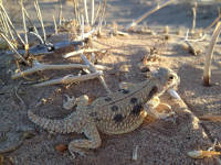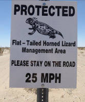 It is specially camouflaged from predators with side fringes that eliminate shadows in the open desert -- it is kind of a stealth lizard, like the F-35 that "conceals" itself from radar. Too, different populations can match their bodies to local soil or rock using a combination of color-creating cells, including black melanophores and red chromatophores in the upper layer, scattered over a layer of reflective white iridophores. For food, they prefer ants, which they catch with a flick of their tongue and swallow without chewing. Apparently they are immune to the stings of ants, but they coat each ant with a protective mucus as they swallow them. Too, they eat other small insects and they drink dew or rainwater, though they excrete semisolid uric acid and do not urinate. Horned lizard motifs appear in the pottery, baskets, and rock art of many Southwest Indian tribes. Mile 6.3: Drive north 6.9 miles to Goldwater Range boundary at sign A (32°37'35.7"N, 114°24'35.3"W). This is the intersection of Foothills Blvd. and 56th Street. Mile 10.5: From boundary, drive north 2.7 miles on paved road to Interstate 8. Congratulations! You have survived El Camino del Diablo. Yuma or Bust! You're almost there.