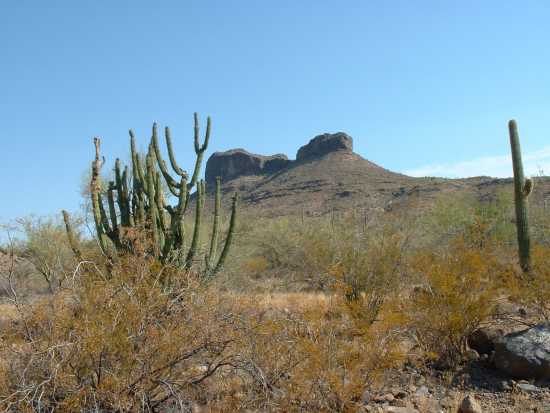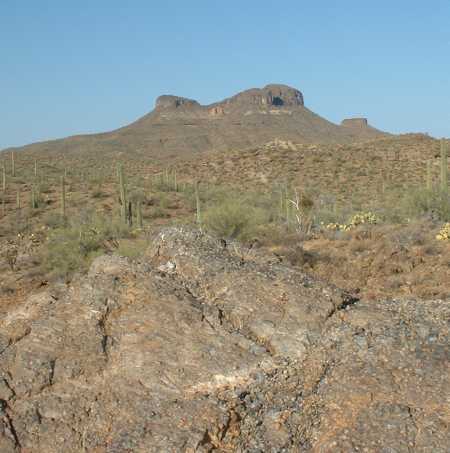 Coffeepot Mountain can be seen from Pipeline Road while you are in the Sauceda Mountains. Its recognizable shape makes it a good landmark for navigation. Here is a view of Coffeepot Mountain's West face, and here is the East face.